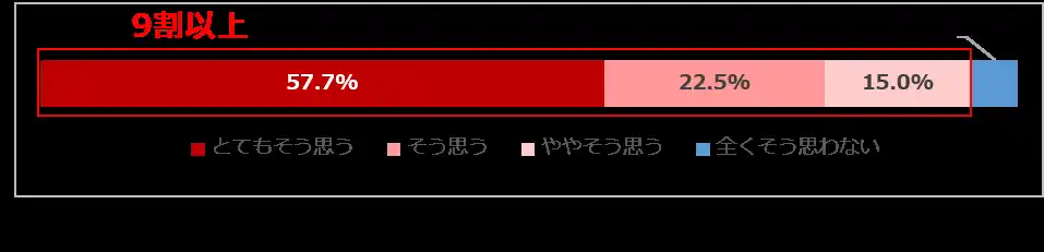 | 現在、賃貸または実家に住んでいると回答した1712名に、「もし住まいを購入するなら、戸建て住宅を検討したいと思いますか?」と尋ねたところ、「とてもそう思う」57.7%、「そう思う」22.5%、「ややそう思う」15.0%を合わせると、9割以上の人が戸建て住宅を検討したいと思っていることが分かりました。(図1) | |||||||||