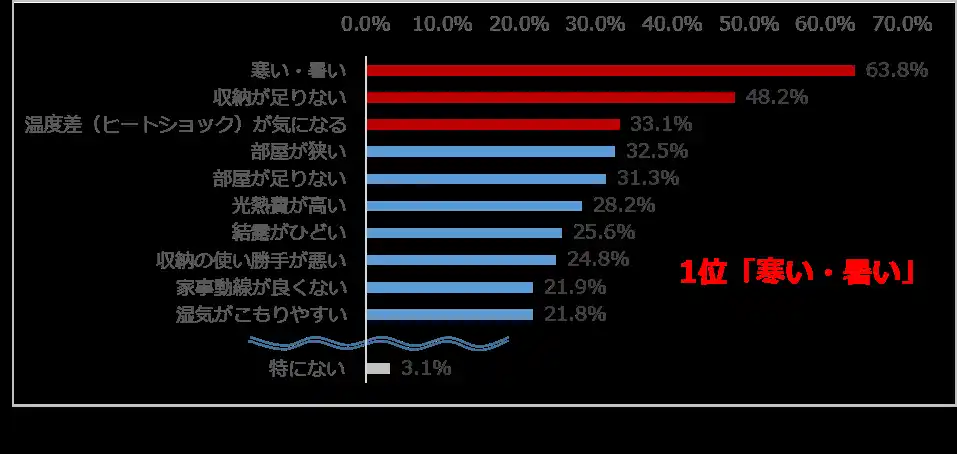 現在の住まいで不満に思っていること1位は「寒い・暑い」。