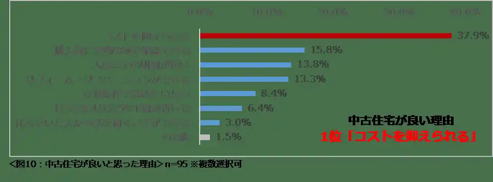 | 購入を希望する住宅の種類が「規格住宅」と回答した272名、「建売住宅」と回答した141名、「中古住宅」と回答した95名にそれぞれその理由を尋ねたところ、いずれも「コストを抑えられる」という回答が最多でした。(図8)(図9)(図10) | |||||||||