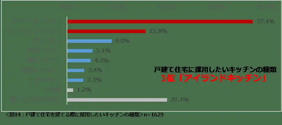 | もし戸建て住宅を建てるなら、採用したいキッチンの種類について尋ねたところ、周囲に壁がない、文字通り島のように設置されている「アイランドキッチン 」(37.4%)が1位、次いでキッチンの左右どちらかが壁に接している「ペニンシュラキッチン」(15.8%)を希望していることが分かりました。(図14) | |||||||||