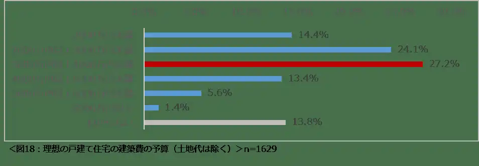 | 理想の戸建て住宅の建築費の予算について尋ねたところ、「3000万円以上4000万円未満」(27.2%)という回答が最多となりました。(図18) | |||||||||