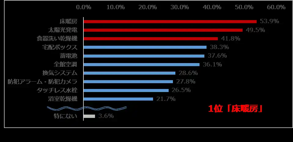 戸建て住宅を建てる際に採用したい設備は「床暖房」が最多で半数以上。