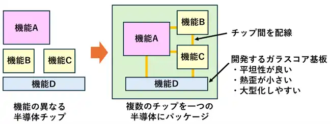 また、仕様変更や機能拡張を行う場合も個別のチップの組合せを変えるだけで対応できます。さらに異なるメーカーのチップを組み合わせるなど柔軟な製品開発が可能になります。このチップレット技術はミクロン単位の配線が必要となるため、従来の樹脂製の基板では平坦性が悪く実現が困難でした。そこで、平坦性が高く、チップ発熱時のひずみが小さいガラス基板が注目を集めています。本プロジェクトでは、このチップレット技術に適用されるガラスコア基板の開発を進めていきます。 |
