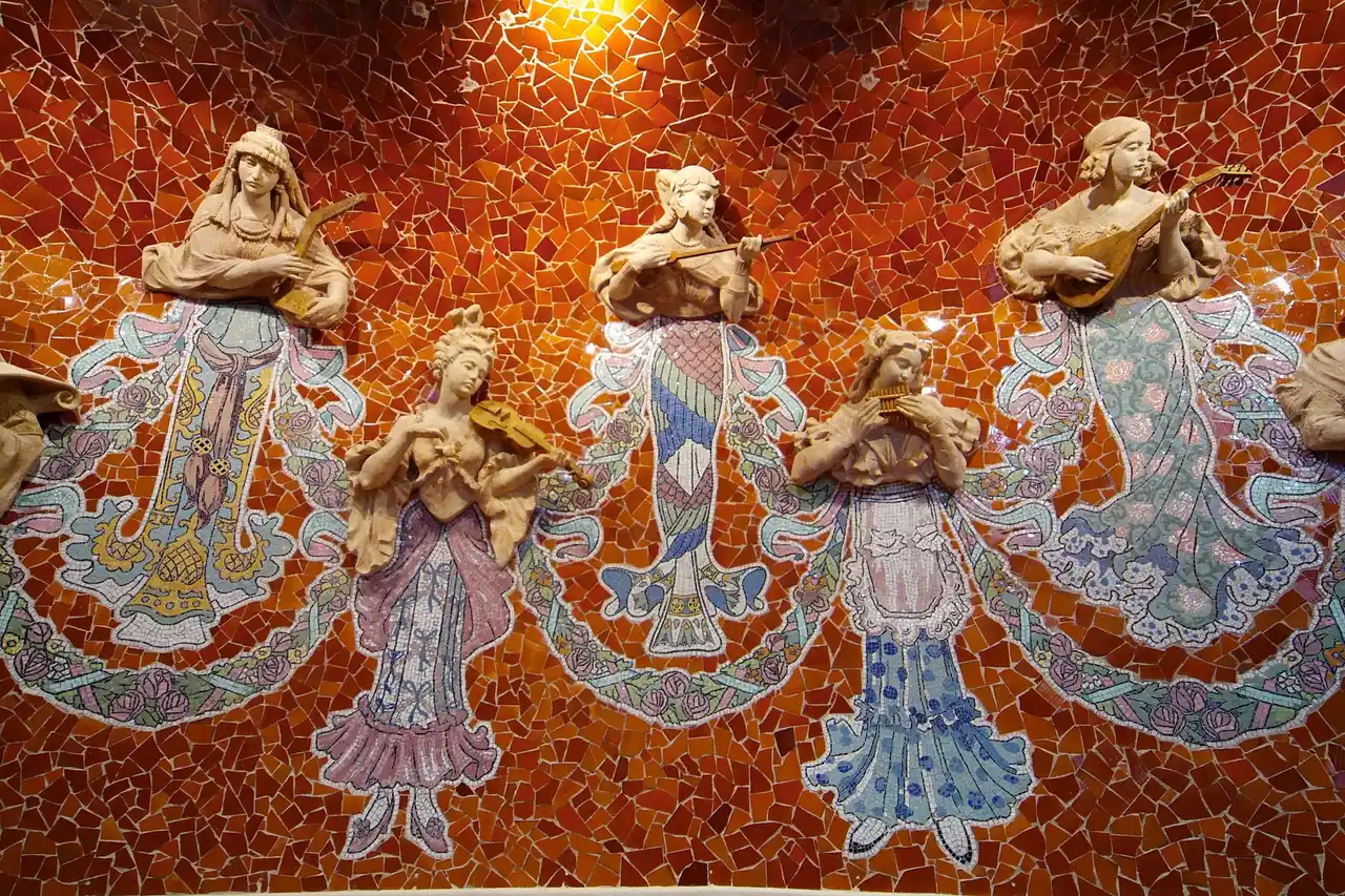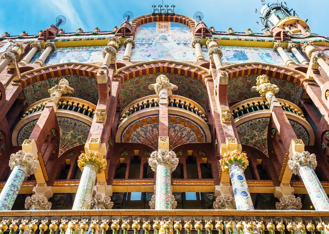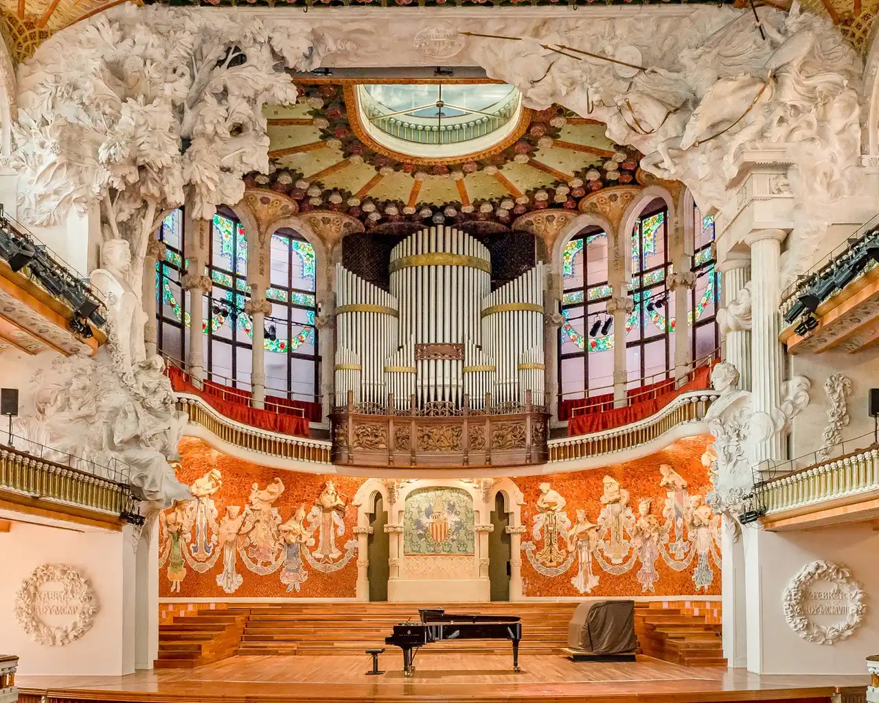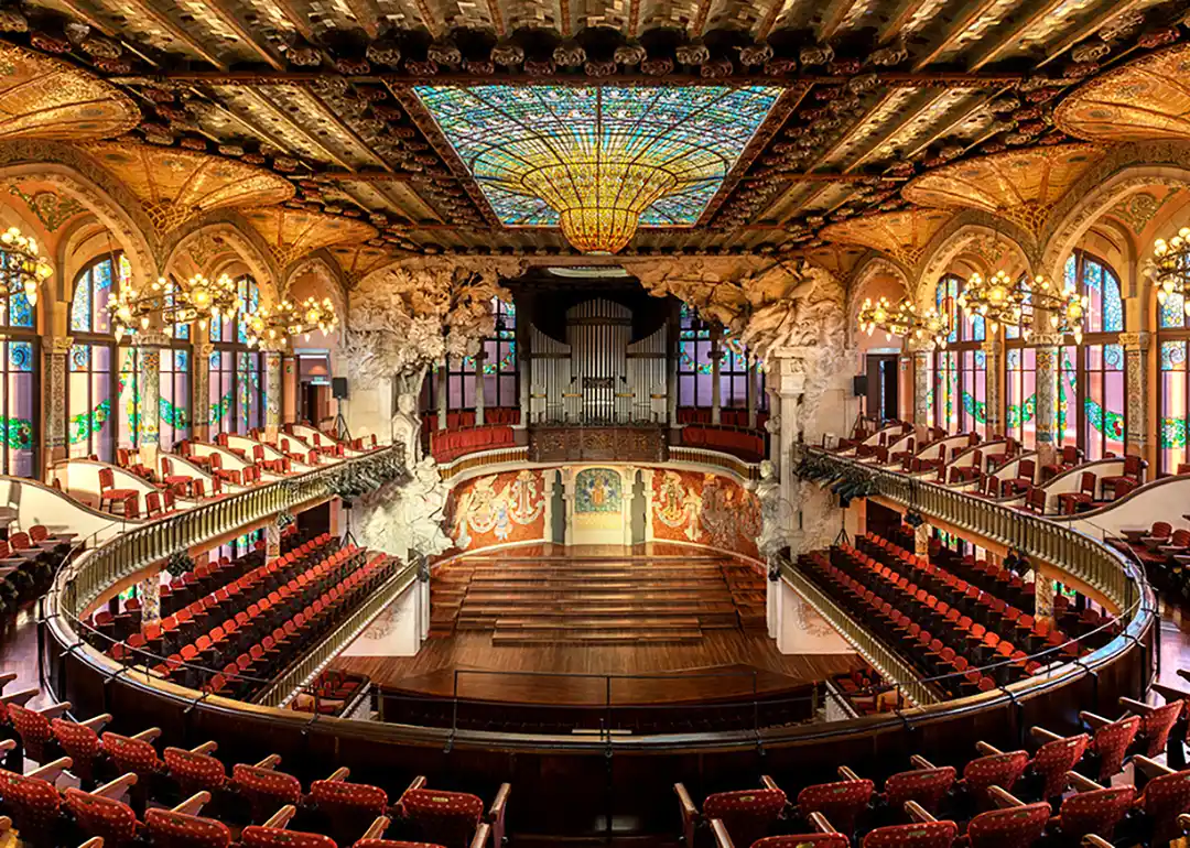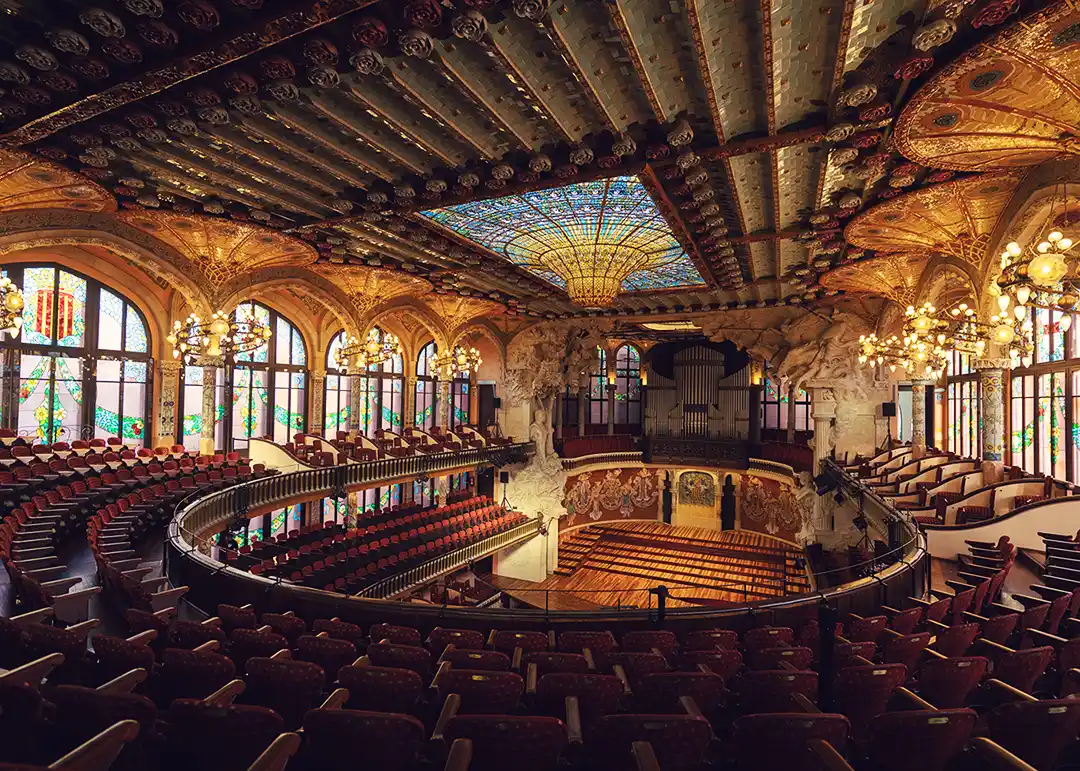 ステンドグラスやモザイク装飾に彩られた華やかな空間は、「光の音楽堂」とも称され、バルセロナを代表する文化施設のひとつです。 |
