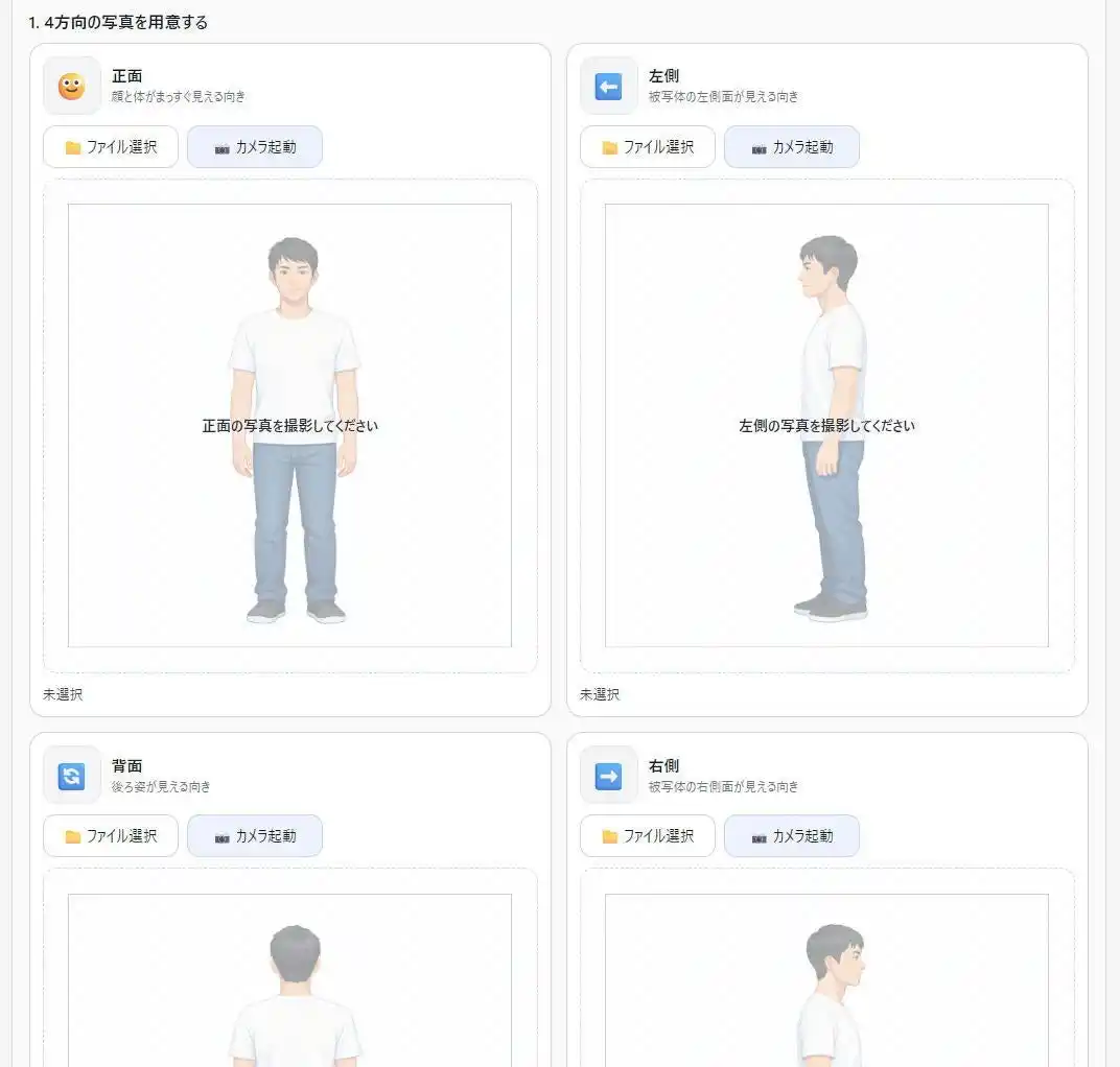 | 今回新たに公開したAIスキャナー機能では、正面・左右・背面の4方向から撮影した写真をもとに、被写体の立体データを生成します。 | |||||||||||||||||