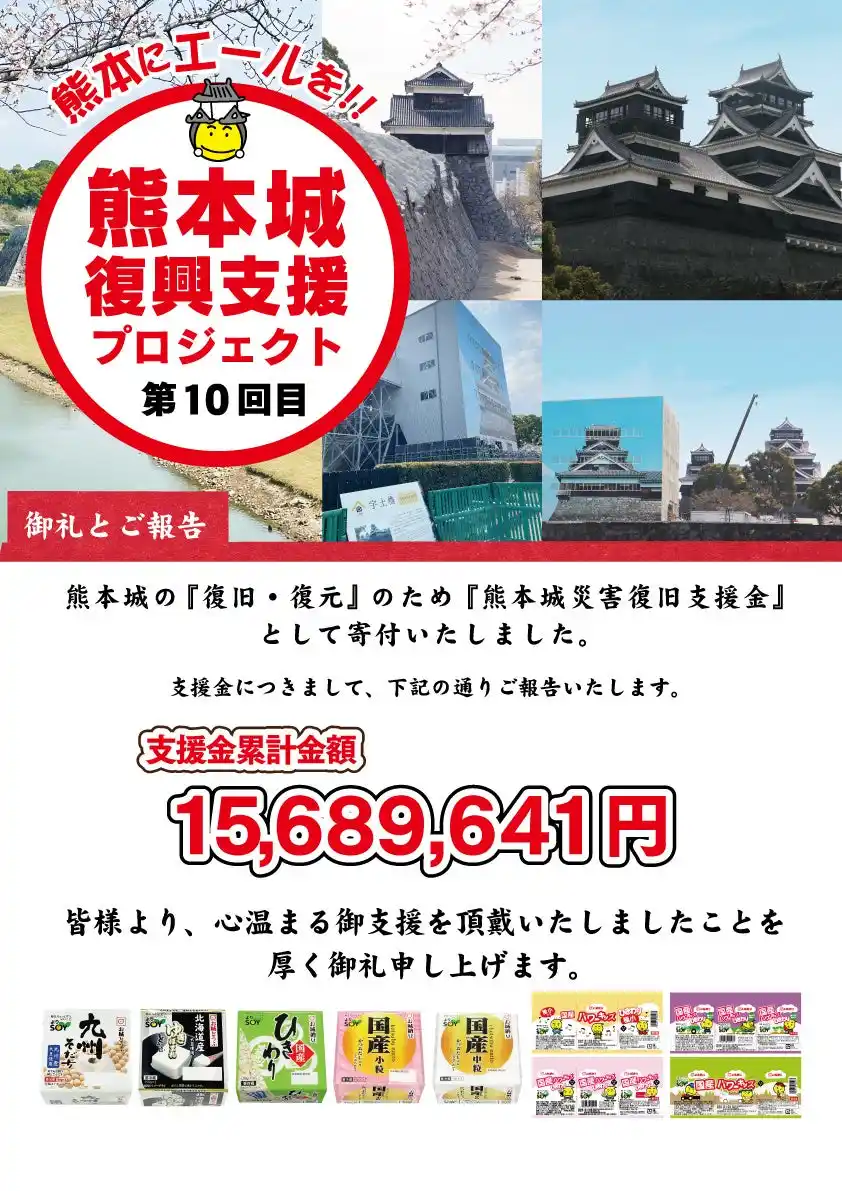 | 株式会社丸美屋は、熊本城の復興を目的に熊本のまちの活気を取り戻すため、平成28年度より「納豆、豆腐を食べて熊本城復興に力を!!」を合言葉に熊本城復興支援プロジェクトを続けております。 | ||||||||||||||||||||