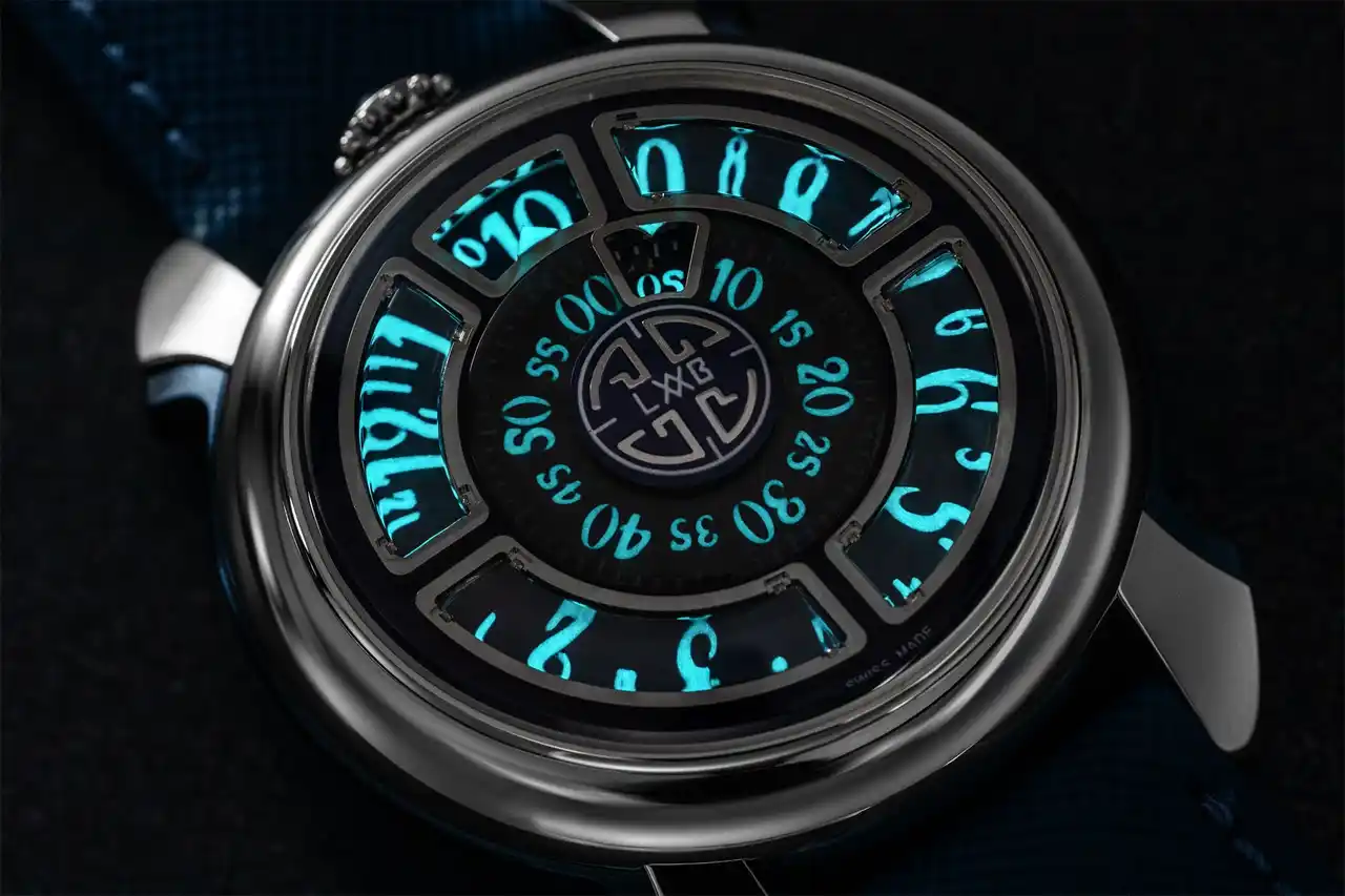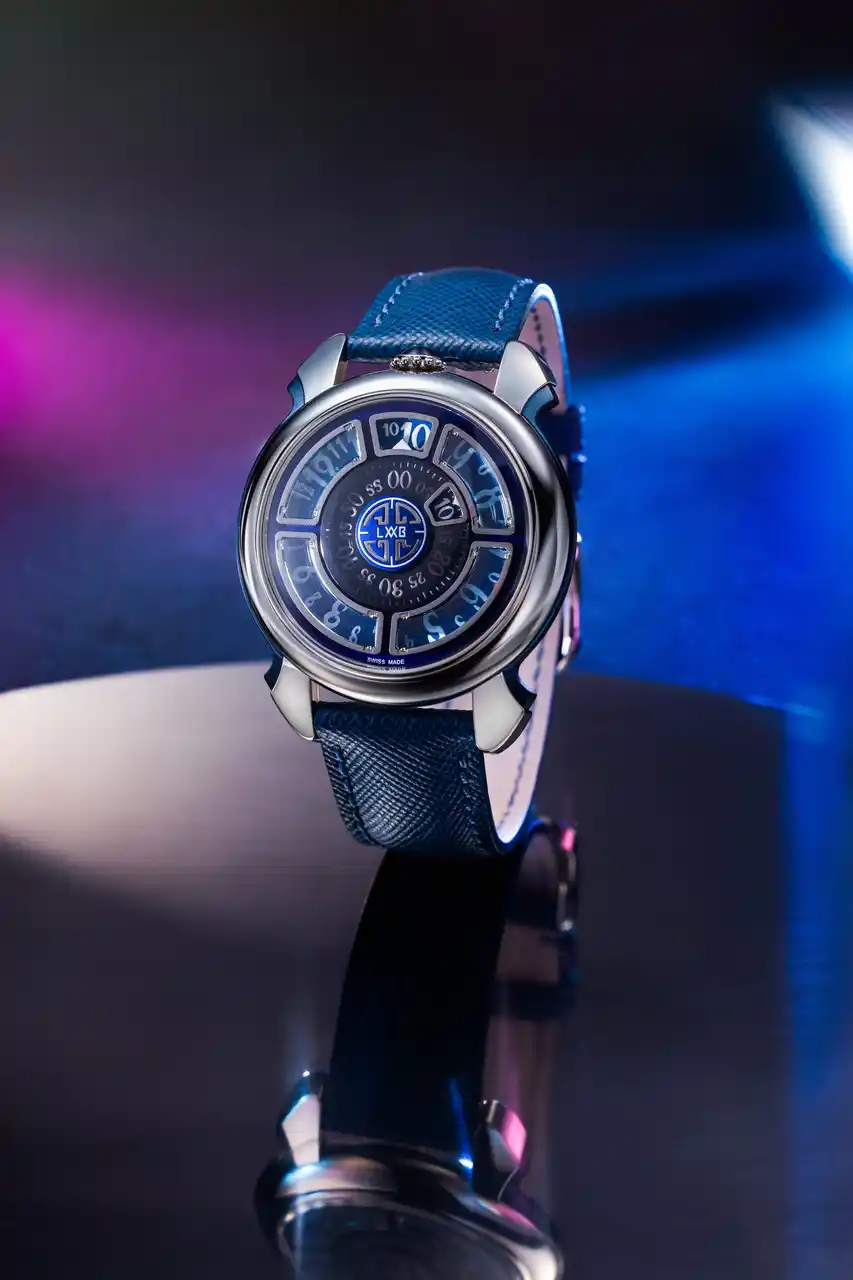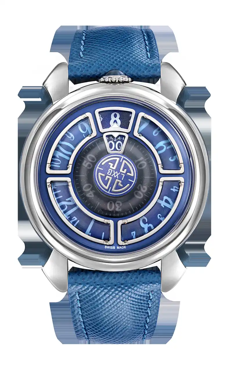 | ダイヤル:ブルーの4セクターダイヤル、12時位置にディスク式の時表示、中央にラピスラズリ製の分表示ダイヤル、円形のスモールセコンド、スーパールミノバのインデックス | |||||||||