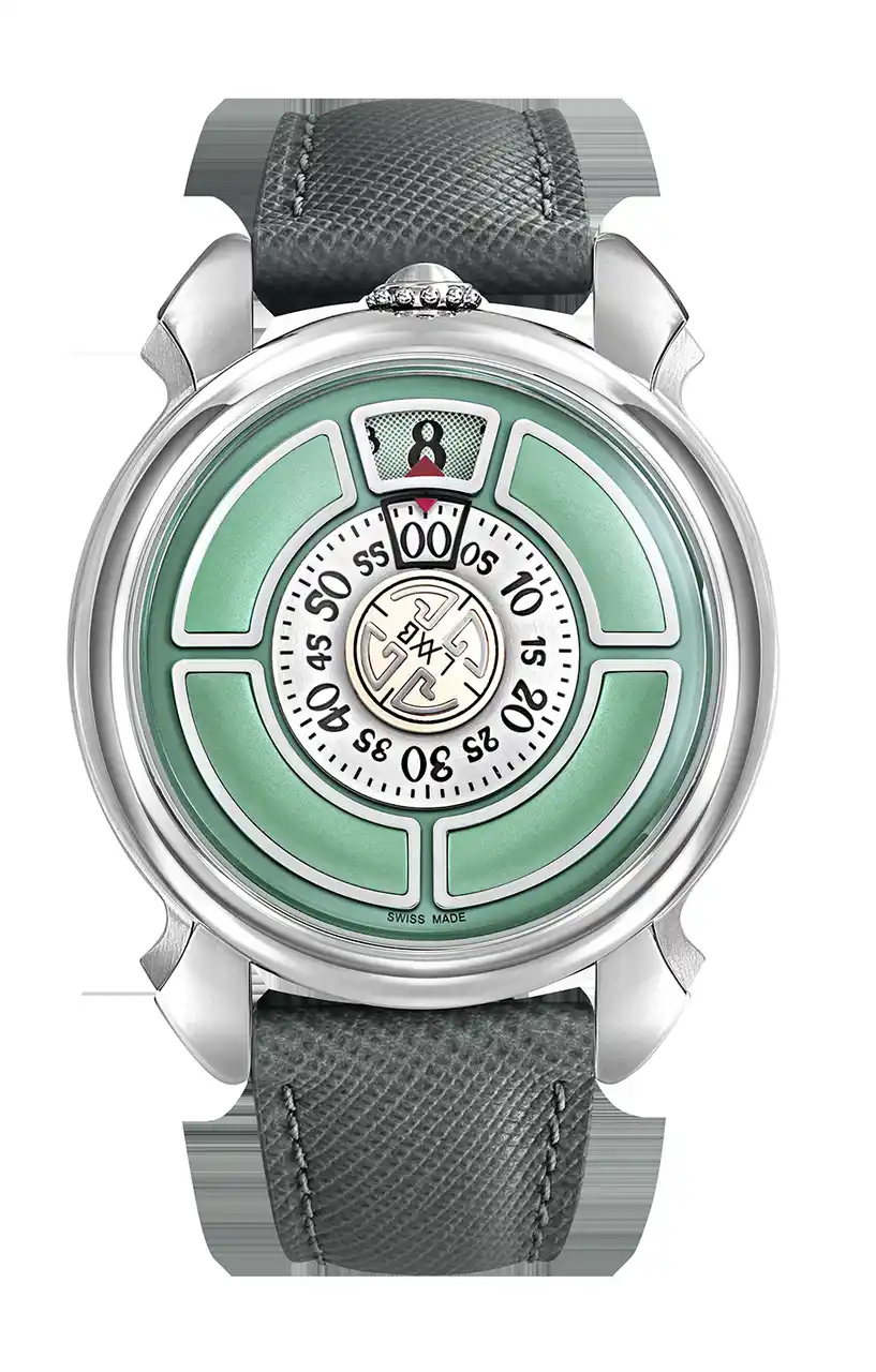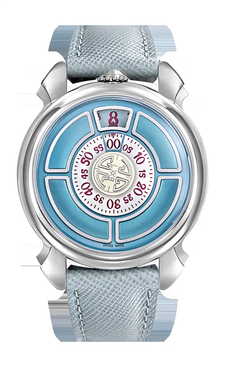 | 特徴:ケース12時位置にリュウズを配置。文字盤12時位置にディスク式の時表示、中央に分表示ダイヤルと、その内側にロゴを刻み込んだ円形のスモールセコンド。 | |||||||||