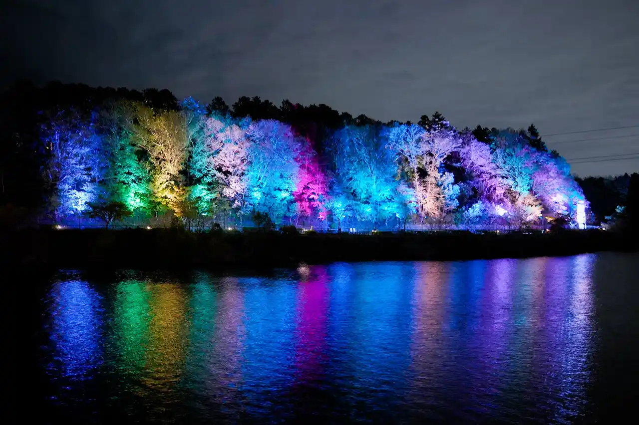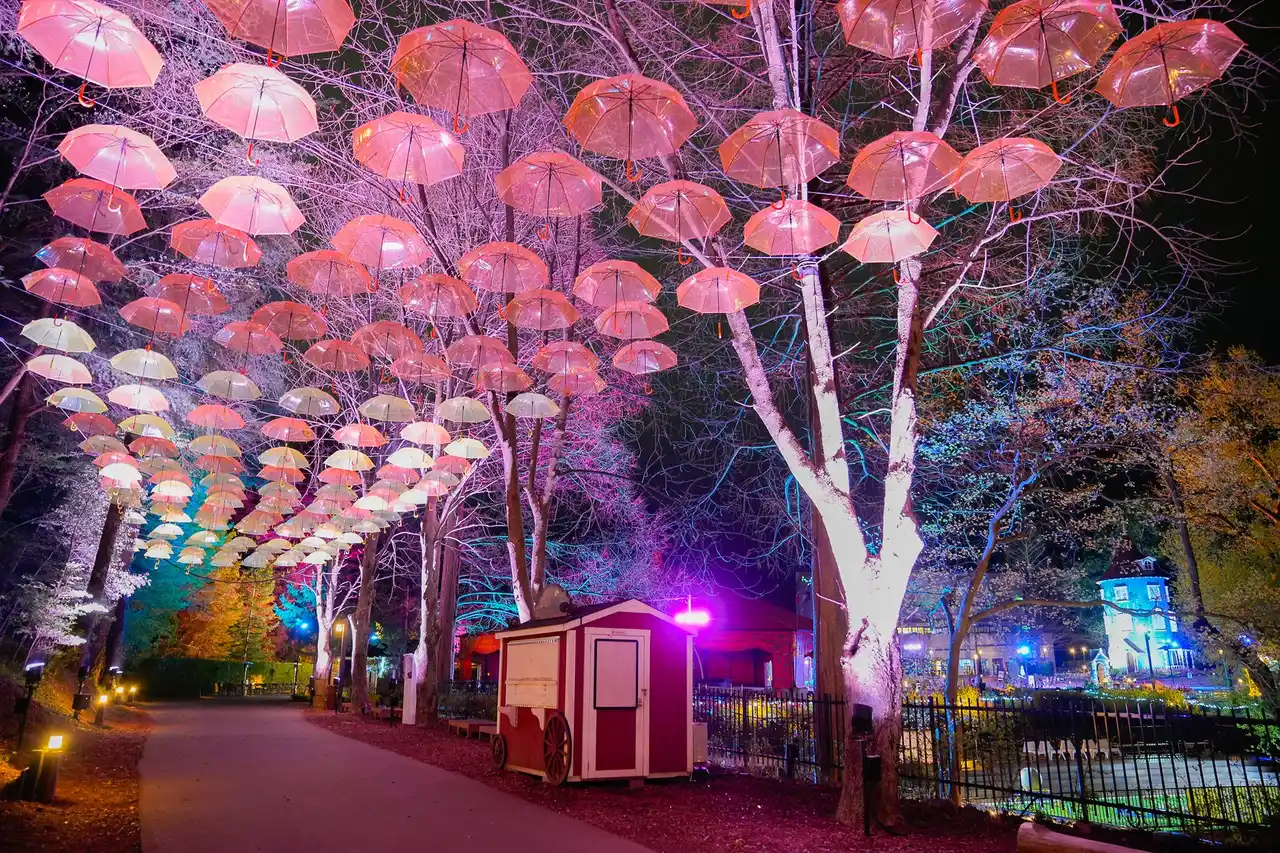 アンブレラスカイロードの対岸にある緑に包まれた小径では、木々を照らすライトの色が変化し、まるで彗星が流れていくような幻想的な光景をご覧いただけます。 |