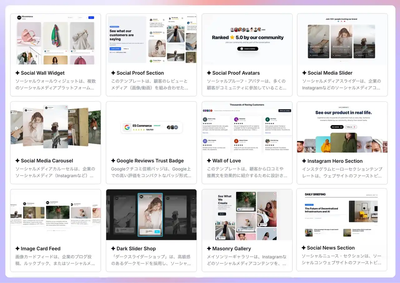 これまでUGCは、口コミ一覧やSNS投稿のグリッド表示として配置されるのが一般的でした。しかしEmbedSocialでは、顧客の写真や投稿、口コミなどを、ヒーロー画像や動的バナー、インタラクティブなセクションとして活用できます。AIによるデザイン生成とリアルな顧客の声を組み合わせることで、信頼性が高く、より魅力的なWebサイトを簡単に制作できます。 |