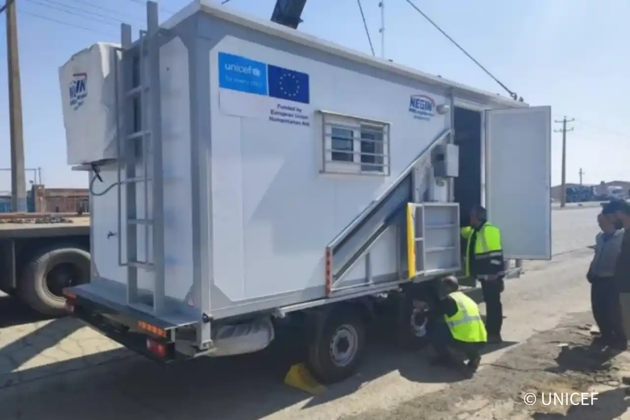 医療ユニットを備えた、ユニセフ支援の車両。高まる支援ニーズを受け、ユニセフは子どもと家族が保健サービスにアクセスできるよう、こうした車両を活用した移動式クリニックの設置を支援している(イラン、2026年3月撮影)(C) UNICEF |