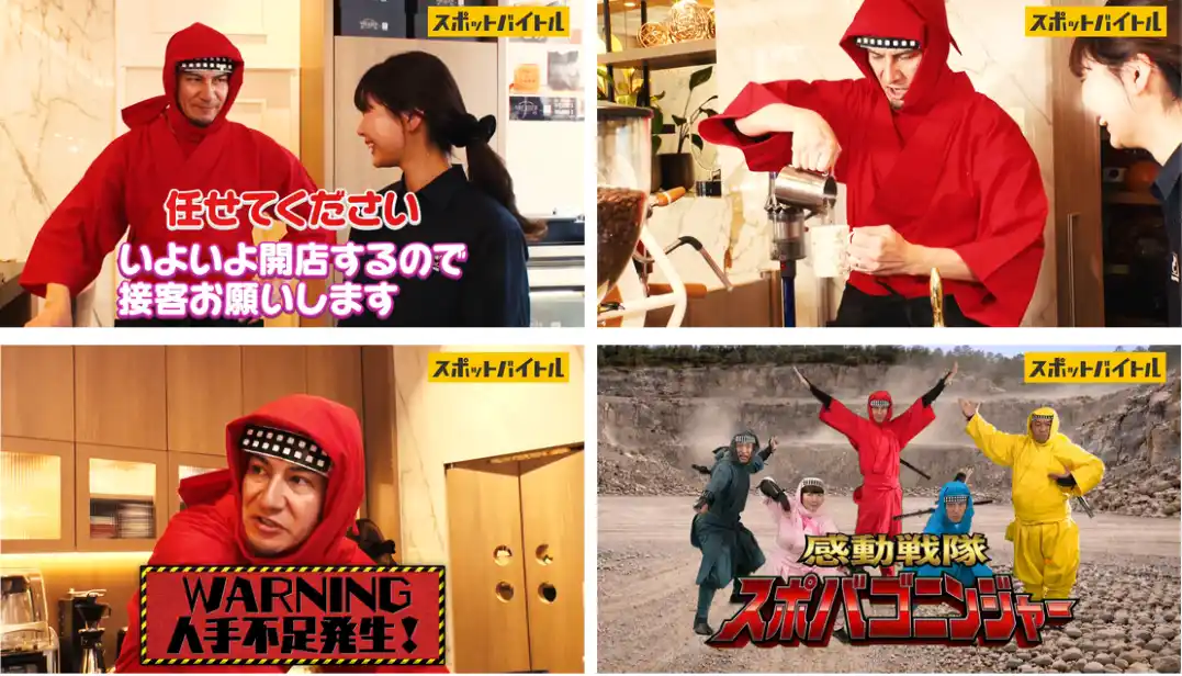 ヒーロー風の忍者コスチュームのままアルバイトを行い、現場での「あるあるネタ」やミッションを面白おかしく紹介します。最後はアルバイト先の人々の温かい人情に触れ、「このバイトっていいなぁ」と視聴者がその職場で働きたくなるような、感動のラストへと繋がります。 |