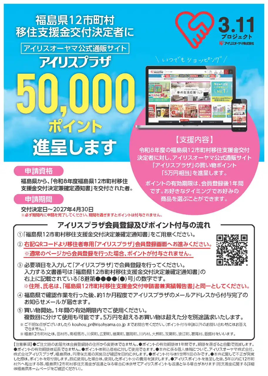 福島県とアイリスオーヤマ株式会社は、2022年に12市町村の移住促進に係る協定を締結しました。交付決定者には上記支援金に加え、アイリスオーヤマ公式通販サイトで利用できるポイントを50,000ポイント進呈いたします。 |
