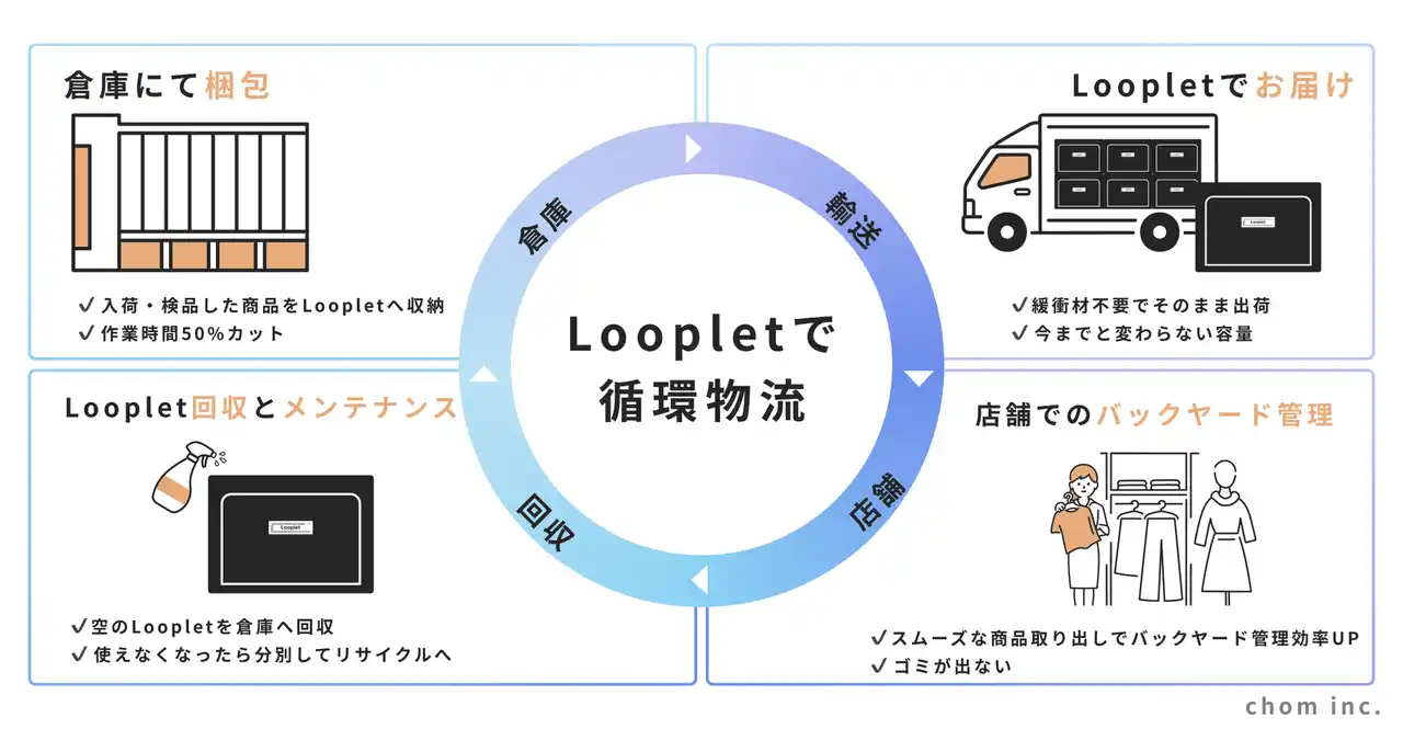 | Loopletは、単なる梱包資材ではなく、回収・再利用までを前提とした循環型の物流システムとして設計されています。 | |||