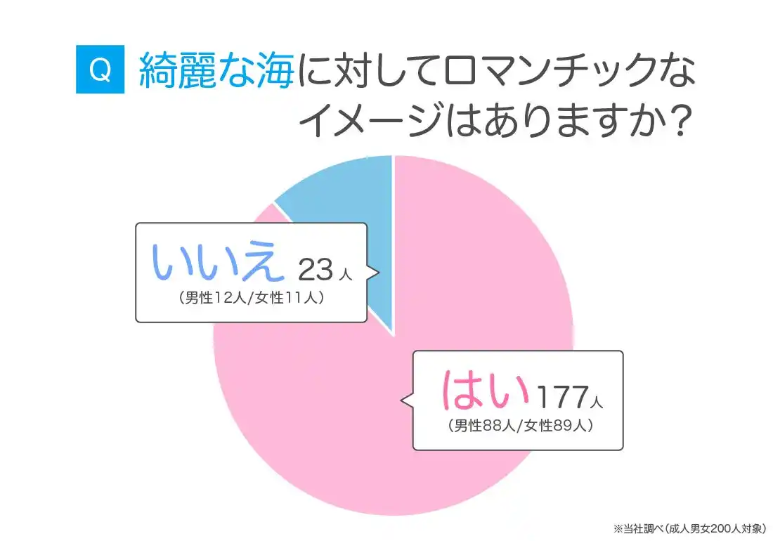 成人男女200人を対象に、「綺麗な海に対してロマンチックなイメージはありますか?」と質問したところ、約9割の人が「はい」と答えました。 |