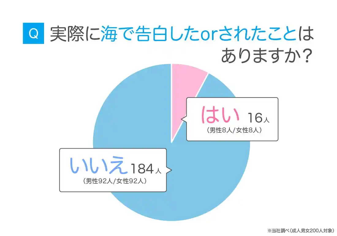 成人男女200人を対象に、実際に海で告白した・されたことはあるか尋ねたところ、「はい」と答えたのは16人で、「いいえ」と答えたのは184人でした。 |