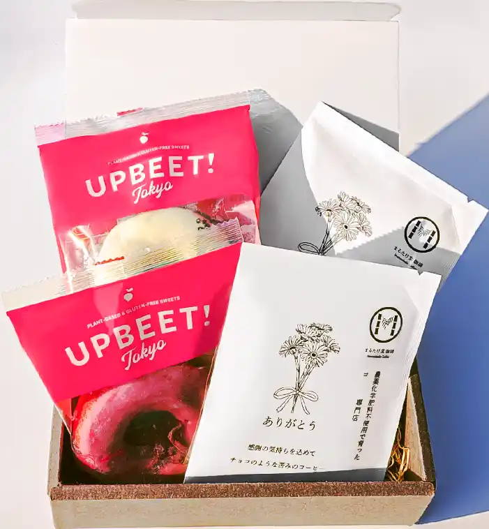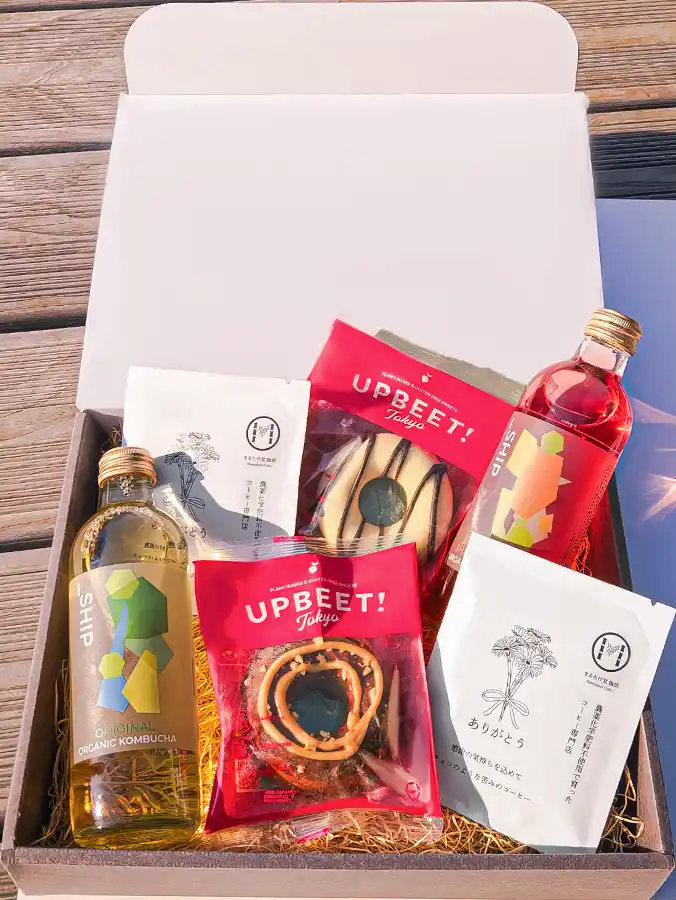 ギフトセットには、当社が製造・販売を手がける有機JAS認証を取得した発酵スパークリングティー「_SHIP KOMBUCHA」、玄米粉などの栄養素の高い原料を使用したプラントベース(ヴィーガン)&グルテンフリーのスイーツブランド「UPBEET!Tokyo」、農薬や化学肥料を一切使用せずに栽培されたコーヒー豆を焙煎した「まるたけ堂珈琲」の珈琲などを詰め合わせました。 |