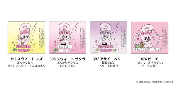 愛くるしい丸みを帯びたフォルムと大きな瞳、長い大きな耳が特徴のエスターバニー。ふわふわとしたやわらかさを感じる毛並みと、優しい表情が可愛いらしく、親しみやすさと癒しを届けてくれるキャラクターです。今回のコラボレーションでは、キュートな表情とファッショナブルな世界観を取り入れたデザインを採用。「シュガー ミント」「ユズ」「スィート サクラ」「アサイー ベリー」のカラー毎にエスターバニーの愛らしさを表現しています。一緒に描かれているサブキャラクターにも注目! |