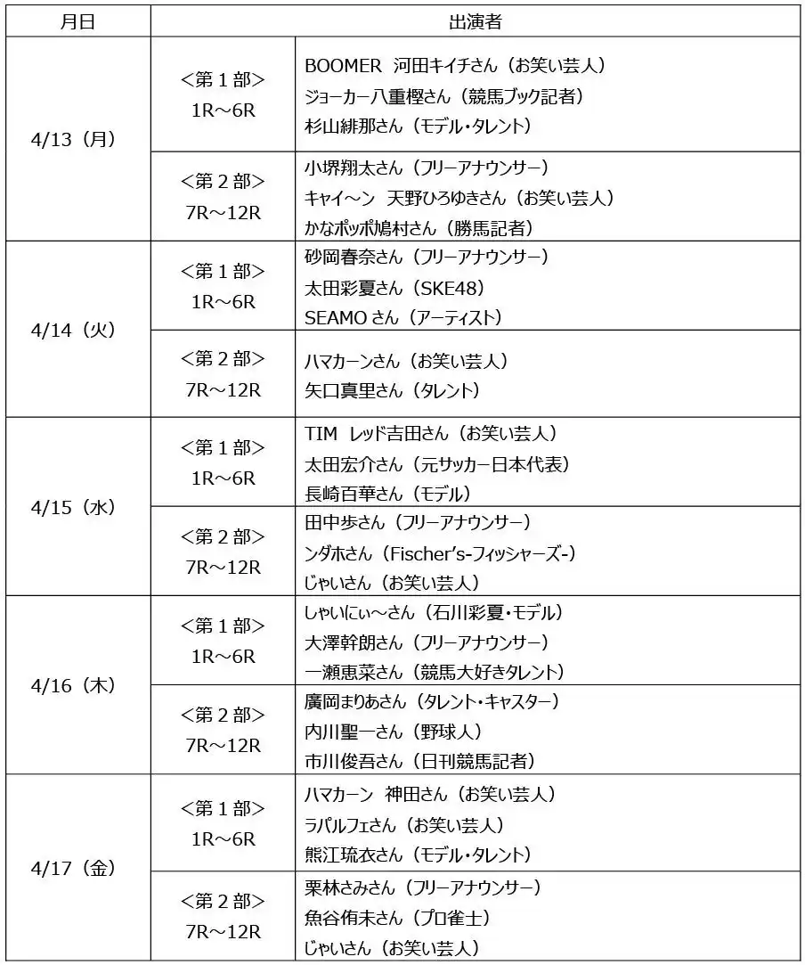4月15日(水)、4月16日(木)の2日間、TCKに精通するゲストが東京スプリントやブリリアントカップの予想に挑戦する「重賞予想トークステージ」を実施します。日替わりのゲスト陣が繰り広げる予想は果たして!? 当日は、ぜひトゥインクルステージにお越しください。 |