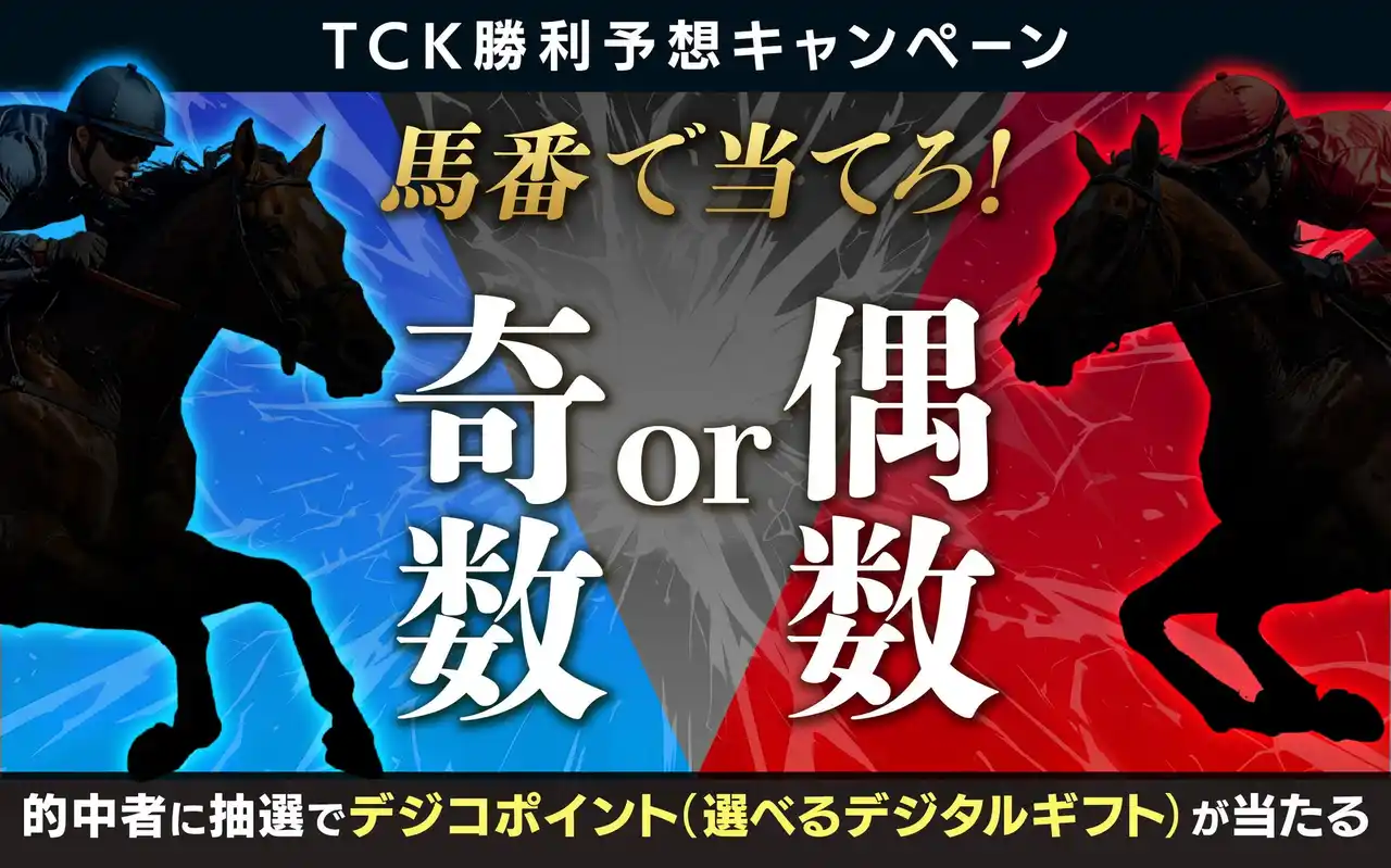 参加方法は、TCK公式Xアカウント(@tck_keiba)をフォローし、「勝ち馬の馬番は奇数か偶数か」を予想してキャンペーン投稿内の選択肢をクリックするだけ!予想が的中した方の中から抽選で100名様にデジコポイントをプレゼントします。 |