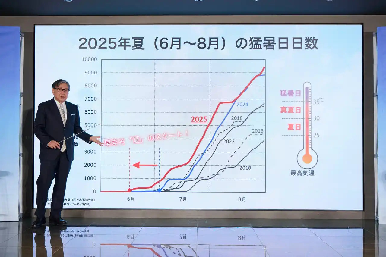 プレゼンテーション後には、株式会社ウェザーマップ会長の気象予報士・森田 正光氏をゲストに迎えたトークセッションを実施しました。森田氏は「異常気象が続き、気候変動の時代になってきている」と語り、近年の日本の夏の気温上昇と都市型熱中症リスクについて解説。科学的データに基づく暑さ対策の新常識を提示しました。 |