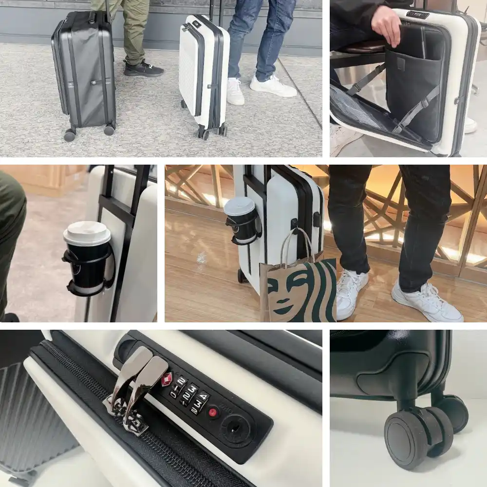 ドリンクホルダー、荷物フック、TSAロック、静音キャスター、三段階キャリーバーなど、日常と旅行を快適にする工夫が満載。