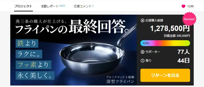 | 本プロジェクトは、開始わずか15分で目標金額30万円を達成し、開始1.5時間で応援総額100万円を突破いたしました。「手入れの手軽さ」と「長く使える耐久性」が支持され、短時間での達成につながっています。 | |||||||||