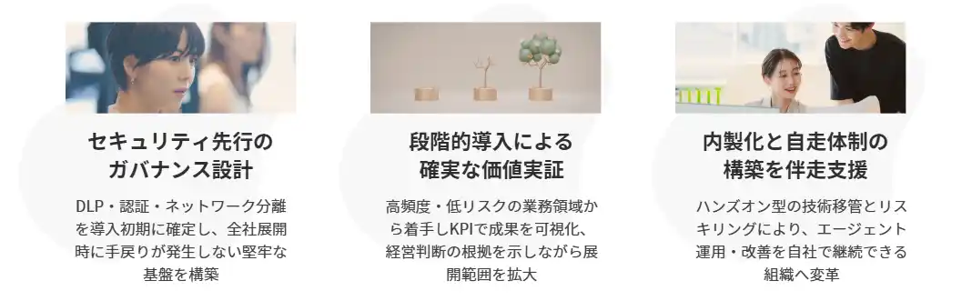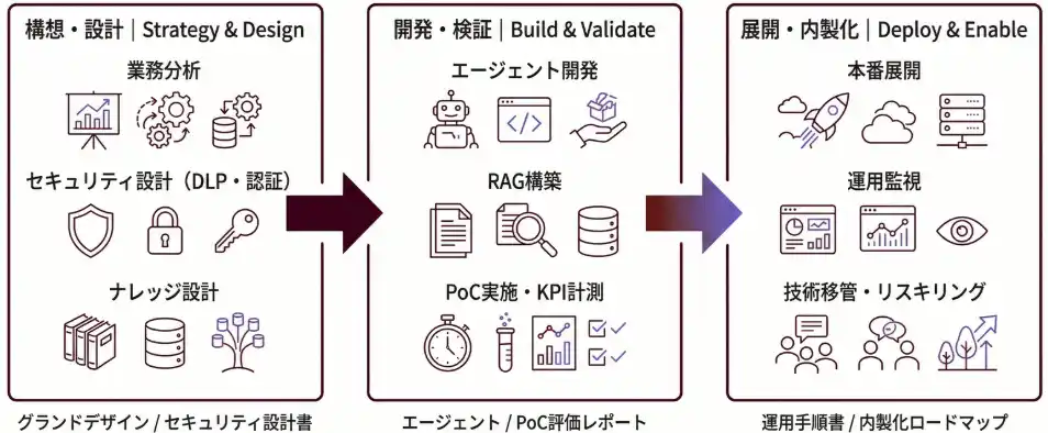本サービスは「構想・設計」「開発・検証」「展開・内製化」の3フェーズで構成されます。 |