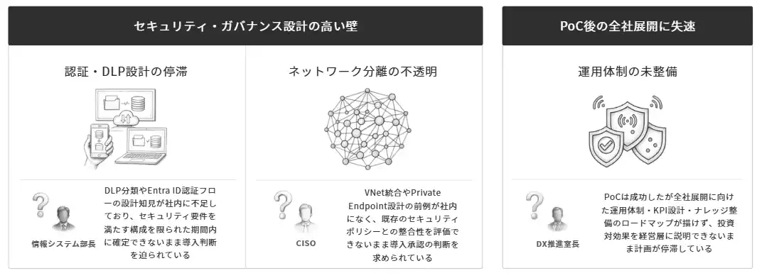DX推進室では、対象業務の選定基準やセキュリティガバナンスの整理に社内知見が不足しており、PoC計画すら策定できないまま導入検討が停滞するケースが見られます。情報システム部においては、DLPポリシーやEntra ID認証フローの設計知見が乏しく、セキュリティ構成やネットワーク分離要件を確定できないまま導入判断を迫られる状況が続いています。またプロジェクトマネージャーの立場では、PoCは完了したもののナレッジ品質や運用体制が未整備のまま全社展開を求められ、メッセージ消費量の予測やKPI設計の方法論なしに本番化判断を迫られるといった課題が顕在化しています。 |