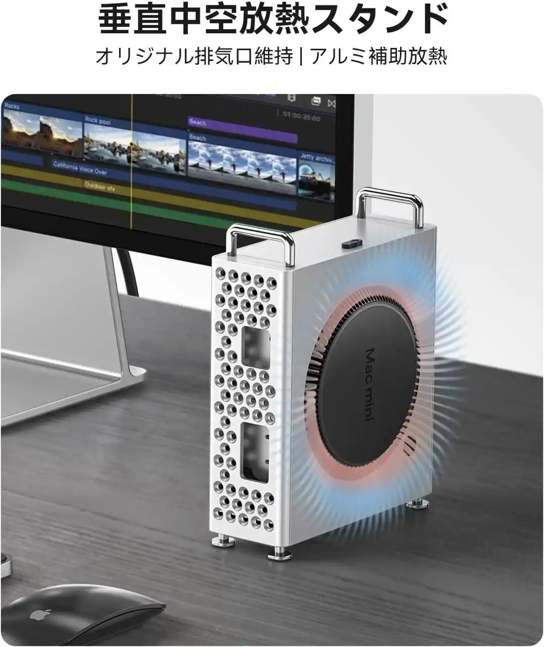Mac mini M4の底面吸気システムを考慮し、縦置きにすることで空気の流れを最適化。 アルミ筐体そのものがヒートシンクのような役割を果たし、長時間の高負荷作業でもパフォーマンスの低下を防ぎます。 |