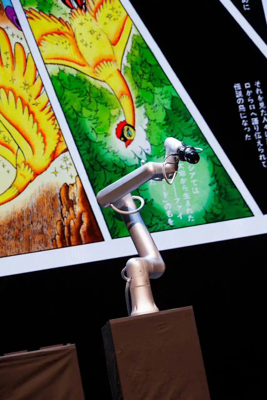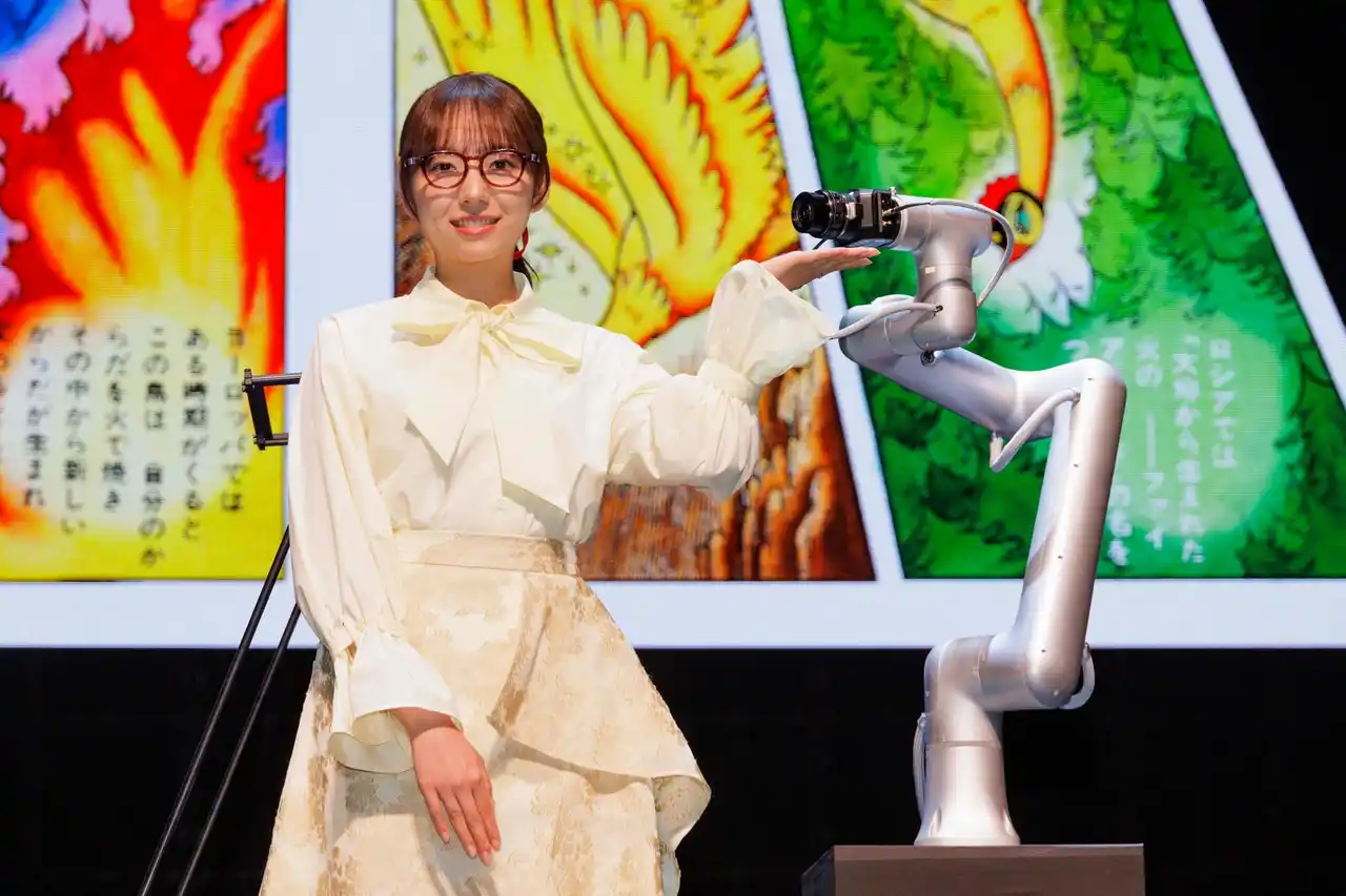 ガイド役として「MANGALOGUER(マンガローガー)」と呼ばれる著名人が毎回ライブで参加するが、この日は元乃木坂46の新内眞衣が登場。正面の巨大スクリーンに映し出された手塚治虫の名作「火の鳥 未来編」のコマに書かれたト書きを読んだり、観客の視線となる鉄腕アームと名付けられたロボットアームと会話をしながら、マンガを読み進める様子を披露した。「ロボットとの共演は初めて」という新内は「ちゃんとコミュニケーションできるのが不思議。本番前、少しご機嫌ナナメで心配しましたがうまくいきました」と話した。ページをめくる役目を果たすのは「高橋さん」という男性。ユニークなパフォーマンスを見せながら「マンガローガー」「鉄腕アーム」とともに舞台を盛り上げる。 |