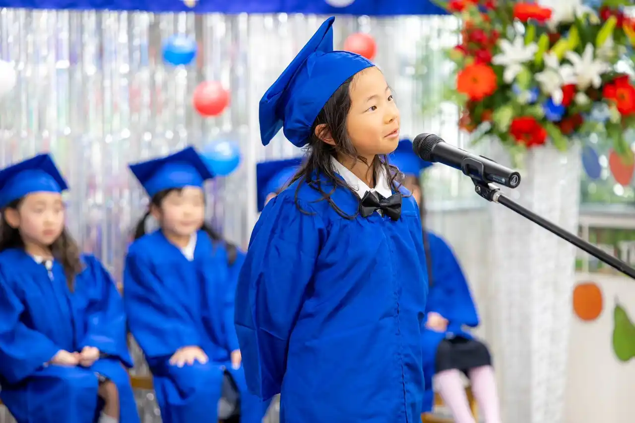 | 園児たちは、英語で自分の思い出や感謝の気持ちをスピーチとして発表します。友達との思い出、乗り越えたこと、楽しかった経験。特に、子どもたちが最後に "I love you" "Thank you" と家族や外国人講師に自分の言葉で伝える経験は、単なる英語力だけでなく、表現力・勇気・伝える力(非認知能力)を育てる大切な機会となっています。 | |||||||||