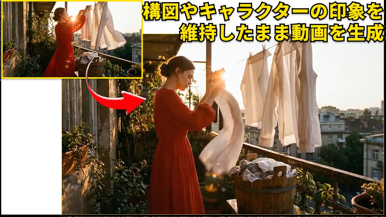 参考画像やテキストを組み合わせることで、構図やキャラクターの印象を維持したまま動画を生成することが可能です。 |