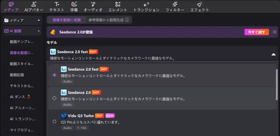 また、HitPaw Edimakorでは「Seedance 2.0」と「Seedance 2.0 Fast」の2種類のモデルを利用可能です。用途に応じて使い分けることで、より快適に動画生成を行えます。 |