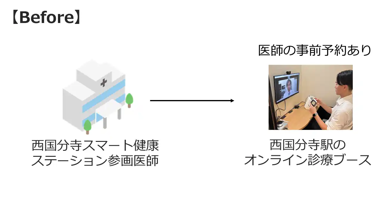 オンライン診療と既存のスマート健康ステーションのリアル拠点やJR東京総合病院等と連携することで、デジタルのみではカバーしきれない検査や対面診療にも円滑につなぎます。関連医療機関の紹介含め、リアルとオンラインが補完し合う安心の医療ネットワークを提供します。駅を起点に、デジタルとリアルが融合した新たなヘルスケアモデルを構築します。 |