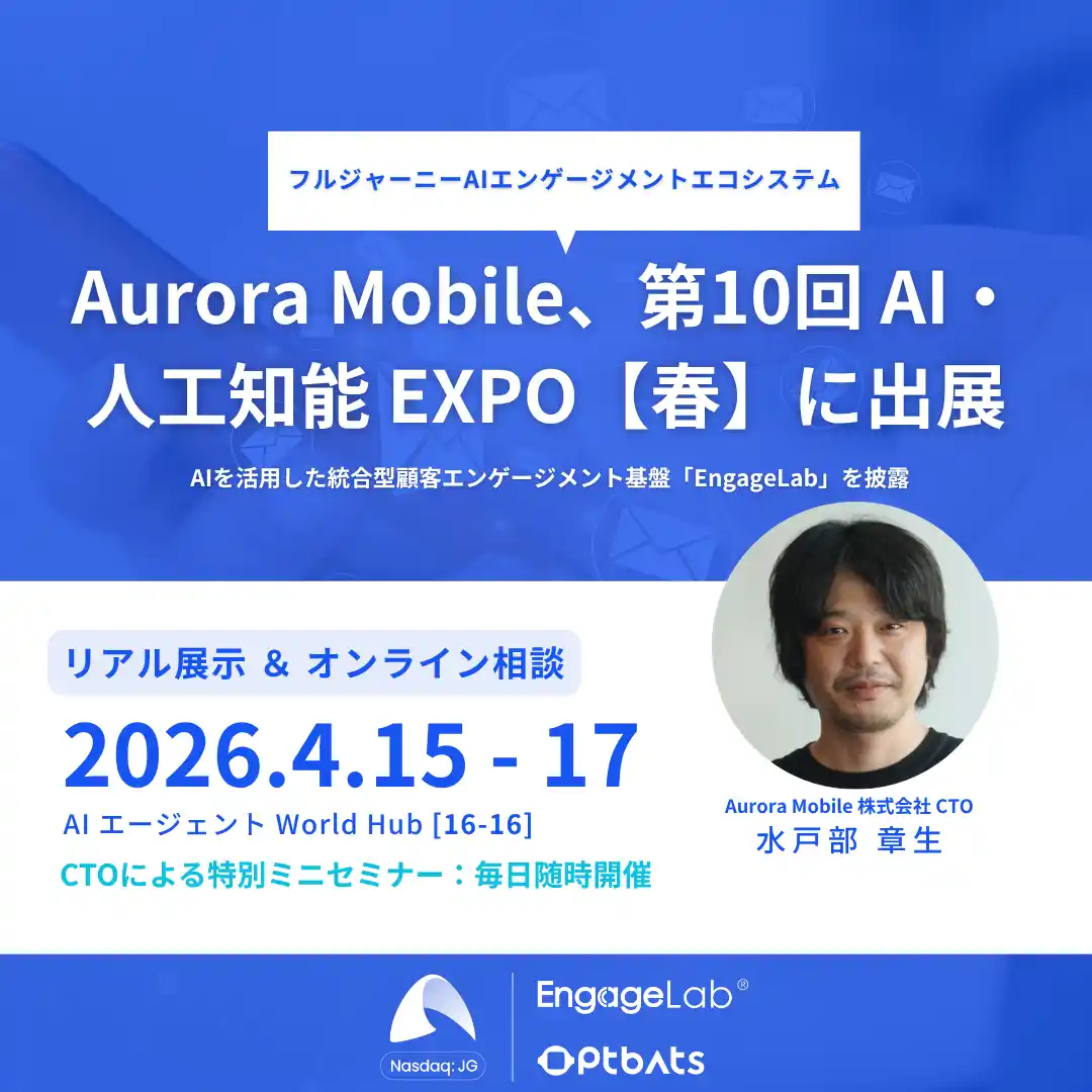 顧客エンゲージメントおよびマーケティングテクノロジーのグローバルプロバイダーであるAurora Mobile株式会社(本社:東京都中央区、以下 Aurora Mobile)は、2026年4月15日(水)から17日(金)まで東京ビッグサイトで開催される「第10回 AI・人工知能 EXPO【春】」に出展することをお知らせいたします。 |