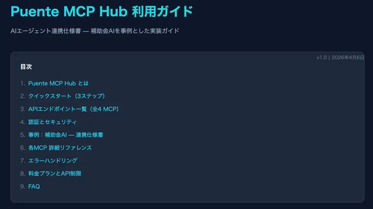 | 株式会社プエンテ(本社:埼玉県所沢市、代表取締役:保科一男)は、日本の公的APIをAnthropicのModel Context Protocol(MCP)対応のSaaSプラットフォームとして提供する「Puente MCP Hub」(https://puentemcp.com)を2026年4月8日より正式提供開始いたしました。 | ||||||||