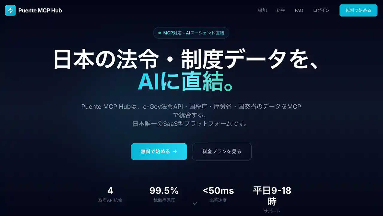| Puente MCP Hubは、日本の主要な公的APIをMCPサーバーとしてラップし、AIアプリケーションから簡単に利用できる形で提供するSaaSプラットフォームです。Claude、ChatGPTなどの大規模言語モデルから、法令検索や法人番号照会、医療機関情報の取得などをシームレスに実行できます。 | ||||||||