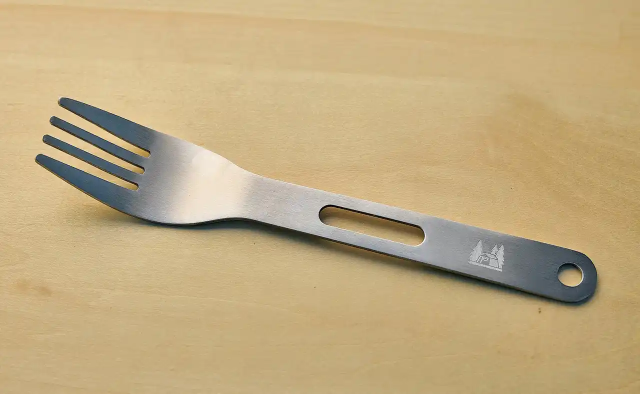 フォークにはogawaのシンボル “オーナーロッジ” のイラストロゴが。『オーナーロッジ1号』は日本初のロッジテントで、1961年に発売された。 |