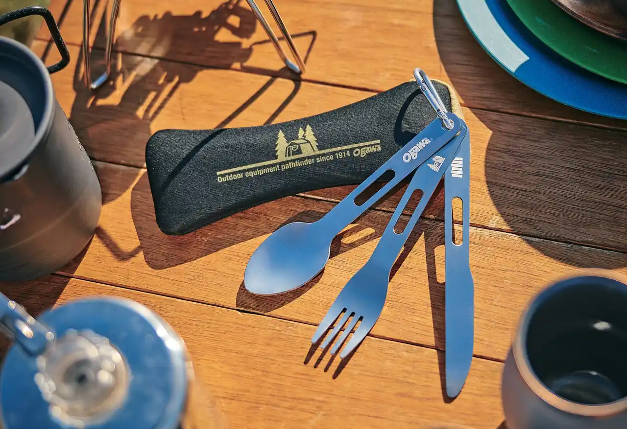 スプーン+フォーク+ナイフに3本をまとめるカラビナ、専用のポーチまでセット。丈夫なステンレス製で、キャンプはもちろん普段使いにも便利な逸品です。