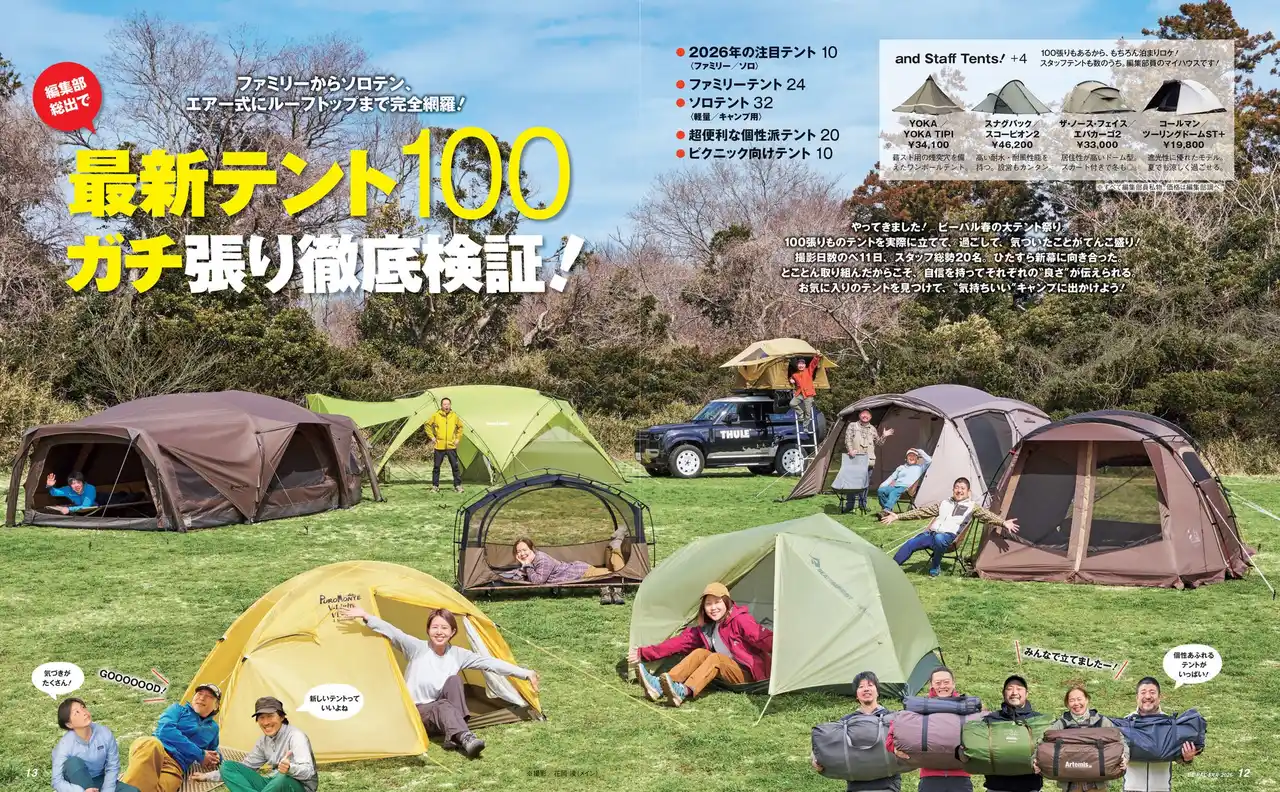 さらに、今号の大特集は「最新テント100 ガチ張り徹底検証!」。アウトドアブランド渾身の新作テントから、車の上につけるルーフトップ、ピクニック用のワンタッチまでオールジャンルを編集部員総出で徹底チェック! 「こんなテントが欲しかった!」が見つかる特集です。 |