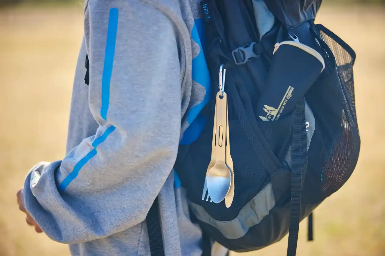 シンプルにカトラリーだけ持ち歩くときはカラビナが大活躍。洗った後干す際も重宝する。 |