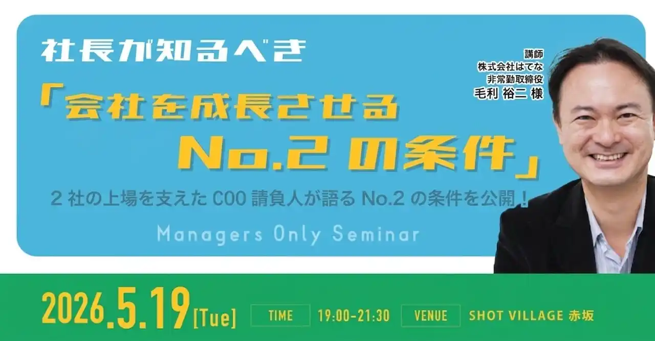 経営者コミュニティ「参謀」を運営する株式会社経営参謀(本社:東京都新宿区、代表取締役:新谷 健司)は、2026年5月19日(火)に勉強会「社長にこそ知ってほしい『会社を成長させるNo.2の条件』とは?」を赤坂会場(SHOT VILLAGE 赤坂店)にて開催します。本勉強会では、株式会社はてな・株式会社アイレップの2社の上場を支えた"COO請負人"こと毛利裕二氏をゲストに迎え、会社を成長させる「No.2」の条件、見つけ方、採用方法、付き合い方について、実体験に基づいた知見をお伝えします。 |