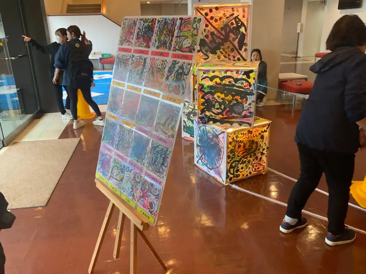 写真:習字とオイルパステルが融合した年長児によるアート作品 |