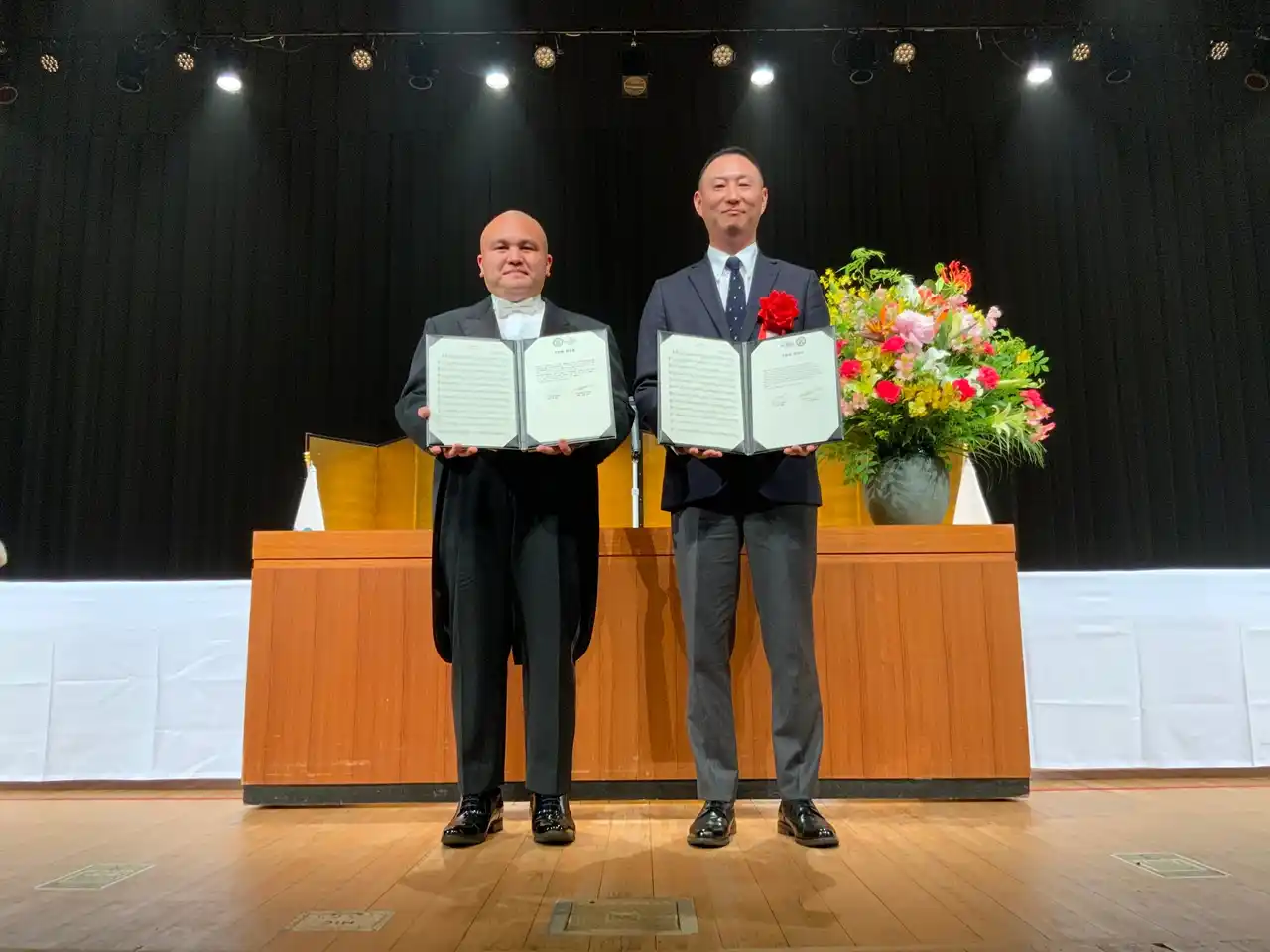 写真:友好曲制定式の様子(作詞:後藤慈明 氏 左 作曲:秋雲燁 氏 右)2024年5月 |
