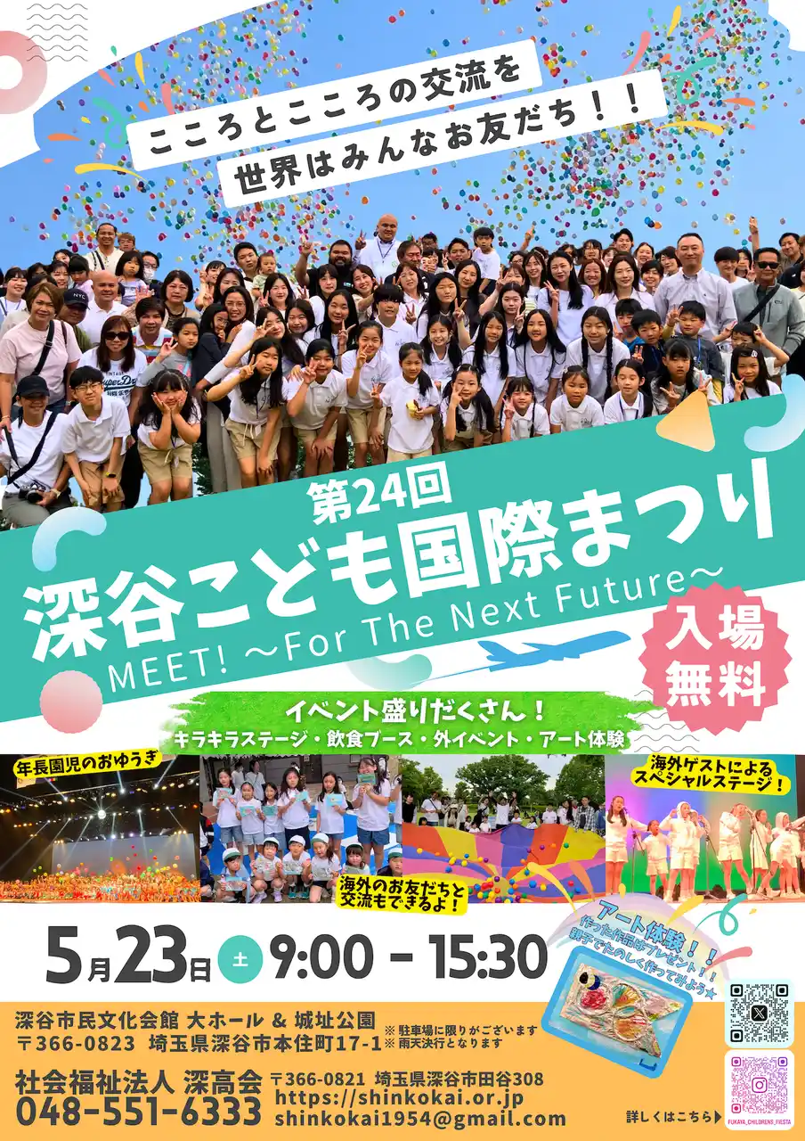 社会福祉法人深高会が主催する今年で24回目を迎える恒例イベント『第24回深谷こども国際まつり MEET! ~For the Next Future~』が、2026年5月23日土曜日に深谷市民文化会館大ホールおよび深谷城址公園で開催されます。このイベントは、先代の故後藤高明統括園長が高校時代の留学経験に基づき、「言葉が通じなくても気持ちは通じ合える」という理念のもと、世界各国から子どもたちを招いて始まりました。現在は、亡き父の跡を継ぎ、自らも留学経験を持つ後藤慈明統括副園長が中心となって実施しています。(写真は過去の様子) |