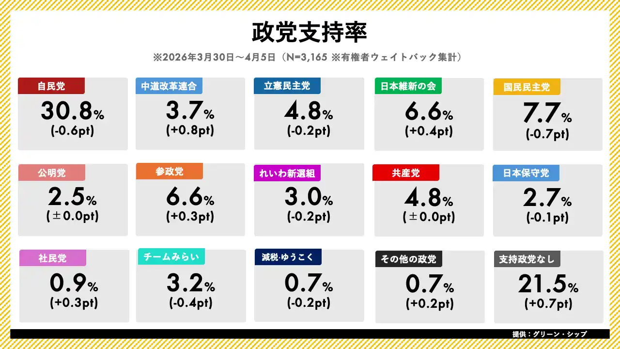 | ジャッグジャパン株式会社(本社:東京都渋谷区)は、株式会社グリーン・シップ(本社:東京都千代田区)と業務提携し、グリーン・シップが提供する日次世論調査「世論レーダー」のデータを提供しております。本日、2026年4月第1週(3月30日~4月5日分)の内閣支持率・政党支持率調査の結果を発表いたします。 | |||