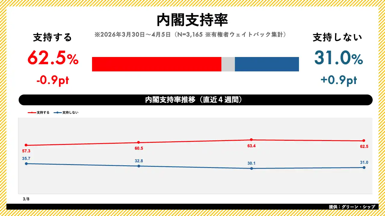 | 高市内閣の支持率は62.5%(前週比-0.9pt)となりました。 | |||