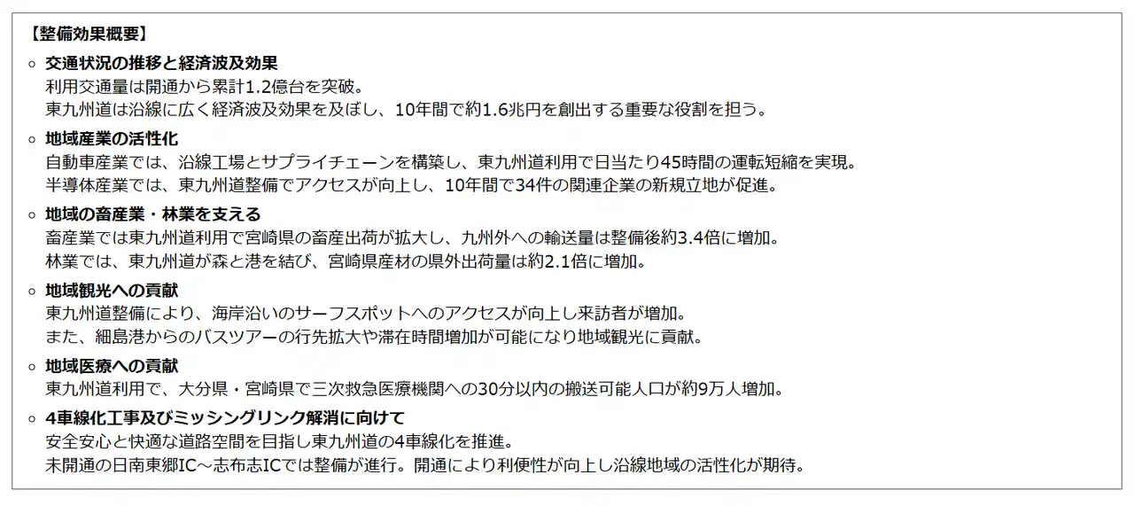 NEXCO西日本九州支社は、2026年4月24日(金曜)にE10 東九州自動車道(北九州市~宮崎市)が開通して10周年を迎えるにあたり、東九州自動車道が果たしてきた役割を振り返るとともに、整備効果として取りまとめましたので、お知らせいたします。 |