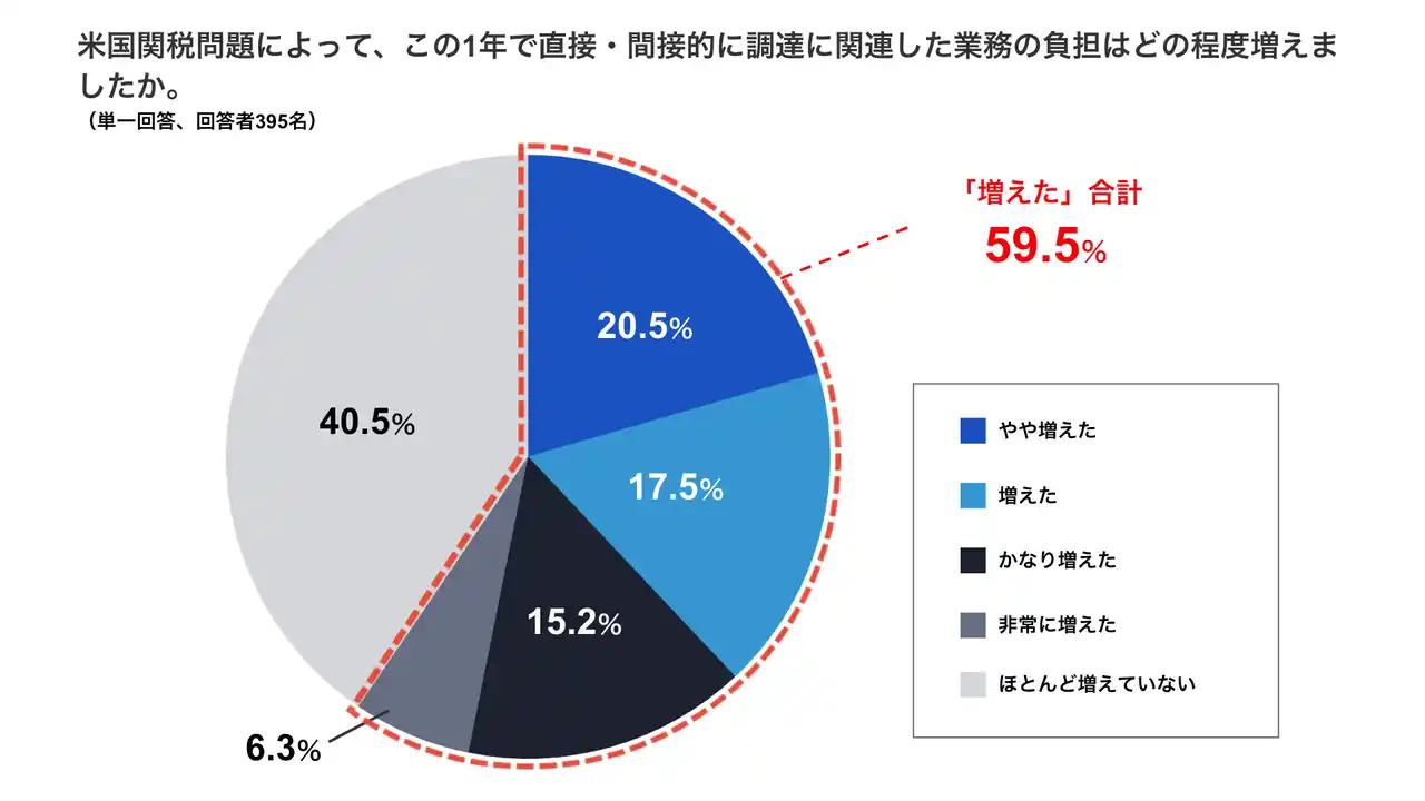 ・管理職の約6割が米国関税問題によって調達に関連した業務の負担増加を実感。「非常に増えた」「かなり増えた」の合計は2割強にのぼりました。 |